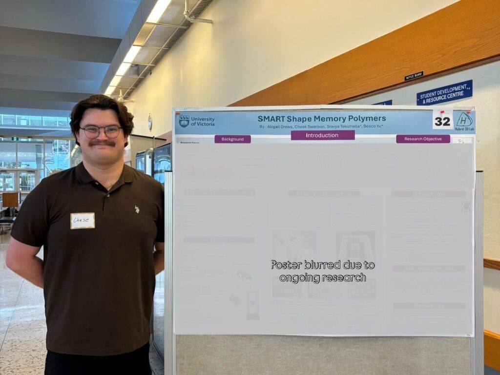 Outside of coursework, I am actively involved in research. I am a member of the Hybrid 3D Lab at UVic where I work on Shape Memory Polymer research, as well as the Sustainable Metal Additive Manufacturing Team. My personal research interests are mostly in tunable vibration damping characteristics in additively manufactured elastomers like TPU, Combining my passion for 3D printing with vibration analysis. Being part of these research teams has strengthened my interesting in teaching, as an academic career would allow me to pursue both research and education.
